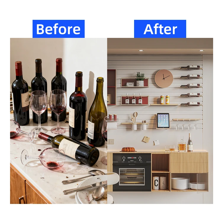 Crafted from high-grade aluminum materials, these floating wall shelves offer exceptional durability while maintaining an elegant, lightweight profile that complements any interior design scheme. The adjustable functionality ensures maximum versatility, allowing users to customize their storage configuration based on evolving needs and spatial requirements. Whether utilized in residential dining rooms or commercial hospitality settings, these decorative wall mount organizer shelves deliver both visual impact and practical storage capacity.